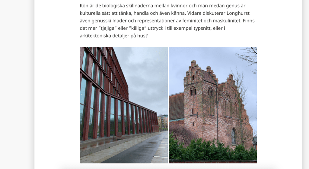 På det stora hela är jag nöjd med mina bilder och tycker att många spännande perspektiv har fångats. Utgångspunkten i processen har varit att se bortom det enkla och tänka lite mer utanför boxen. Fotograferingen av normer är ett exempel på hur jag initialt tänkte att jag skulle ta bilder på stereotypa manliga och kvinnliga saker men att jag sedan valde att omvärdera min idé till att istället leta efter manliga och kvinnliga former i arkitektoniska inslag. En idé jag är mycket nöjd med. I detta blogginlägg hade jag kunnat diskutera normkritik än mer, en kritik från kamratresponsen jag tar med mig.