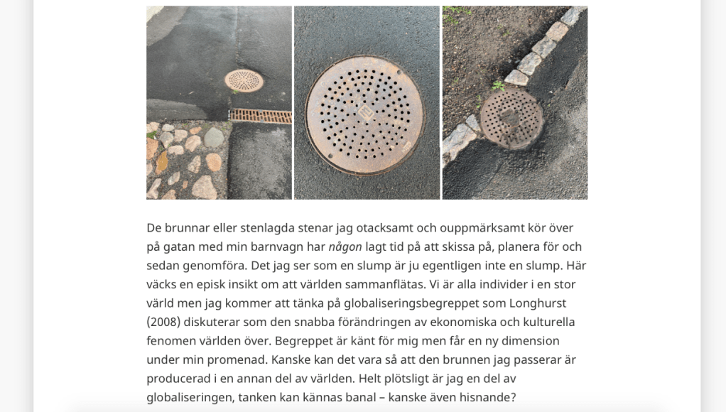 Utifrån mitt perspektiv har det funnits en avsaknad av vidare diskussioner kring publicerade blogginlägg, något jag tror kan ha en berikande effekt. Litteraturseminarierna har varit intressanta, men det hade varit lärorikt att tillsammans med kurskamrater diskutera varandras faktiska blogginnehåll, alltifrån svårigheter kring t.ex. redigering (eller vad det skulle kunna vara) till att ge mer konkreta tips och dela med sig av idéer som har varit berikande för dem. På det sättet tror jag att den formativa responsen kunnat blir mer greppbar och därmed appliceras i större utsträckning under processens gång.
