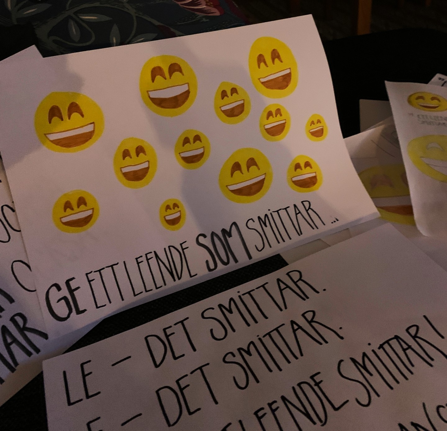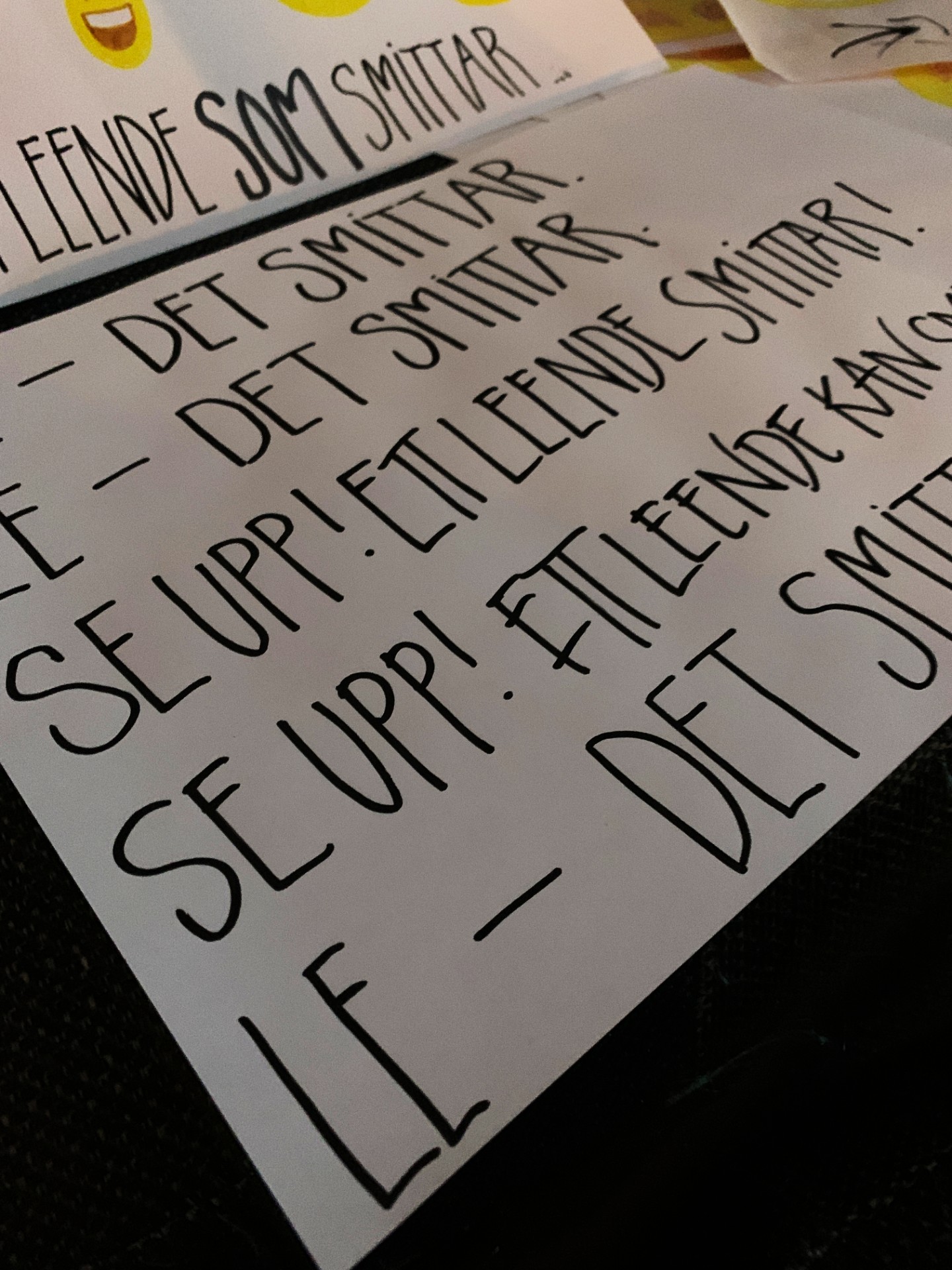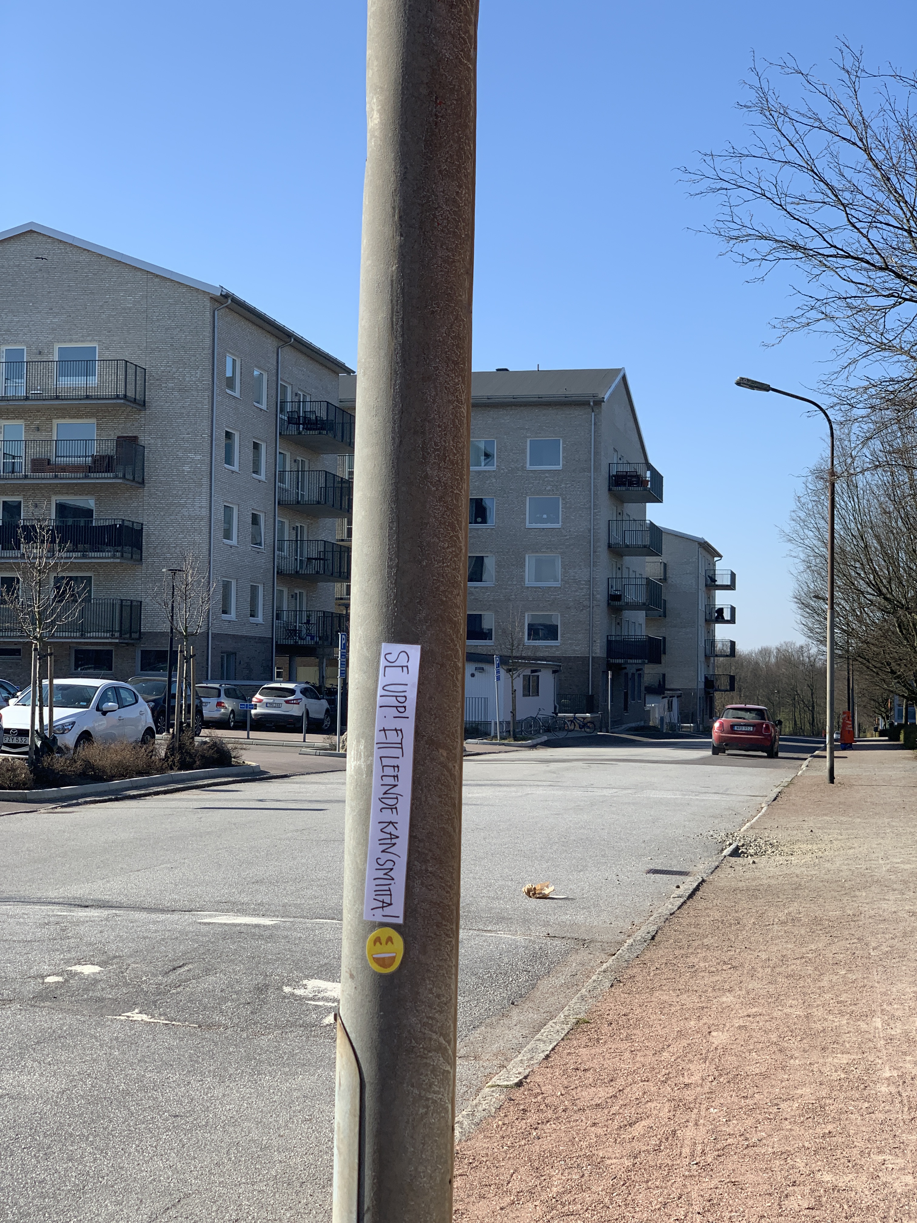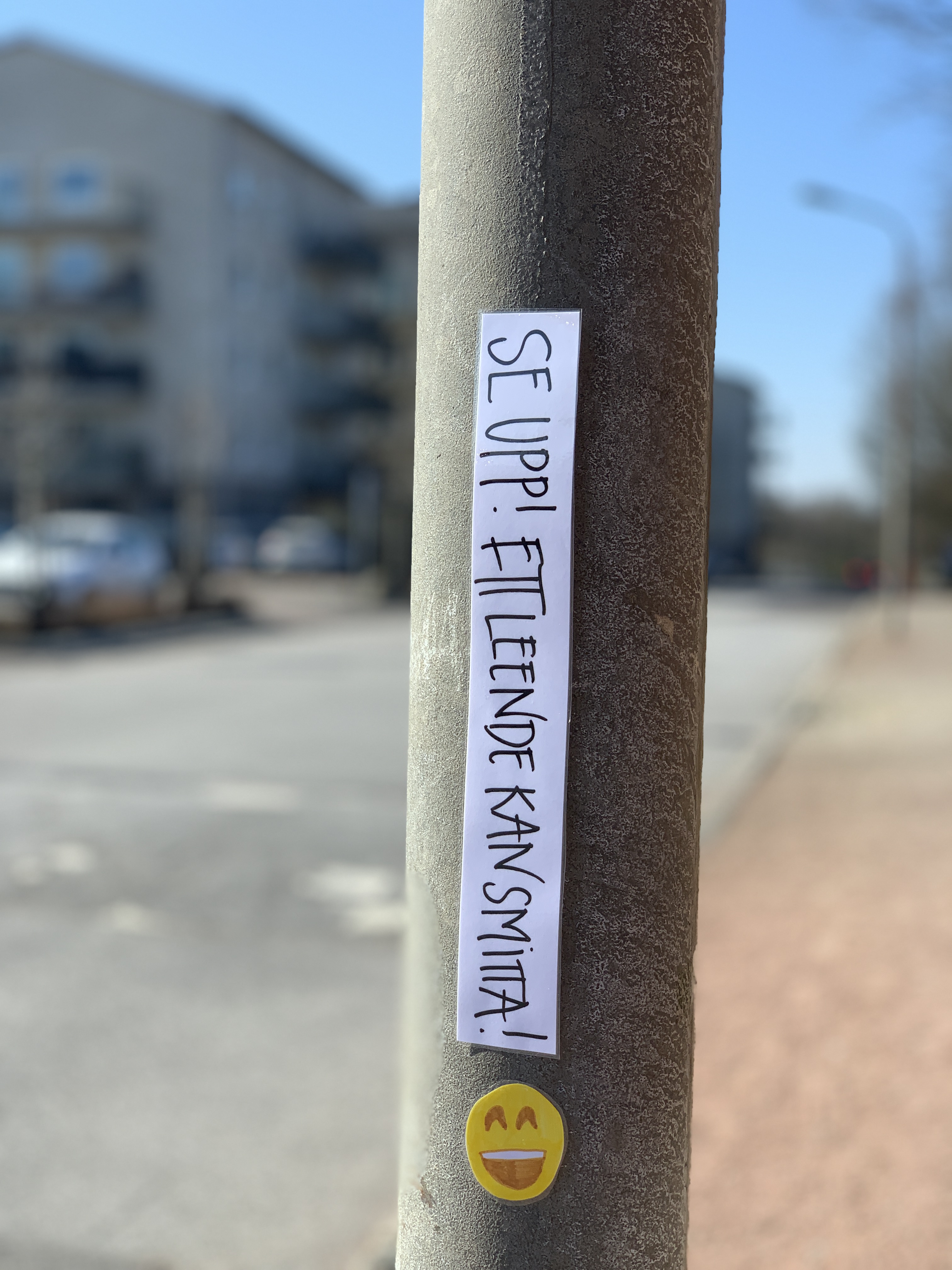 Jag skrev texterna för hand på papper följt av att illustrera glada ”emojis”. Användandet av en emoji skulle göra att fler skulle känna igen den. Det jag sedan gjorde var att laminera allting för att slutligen fästa allting på lyktstolparna.