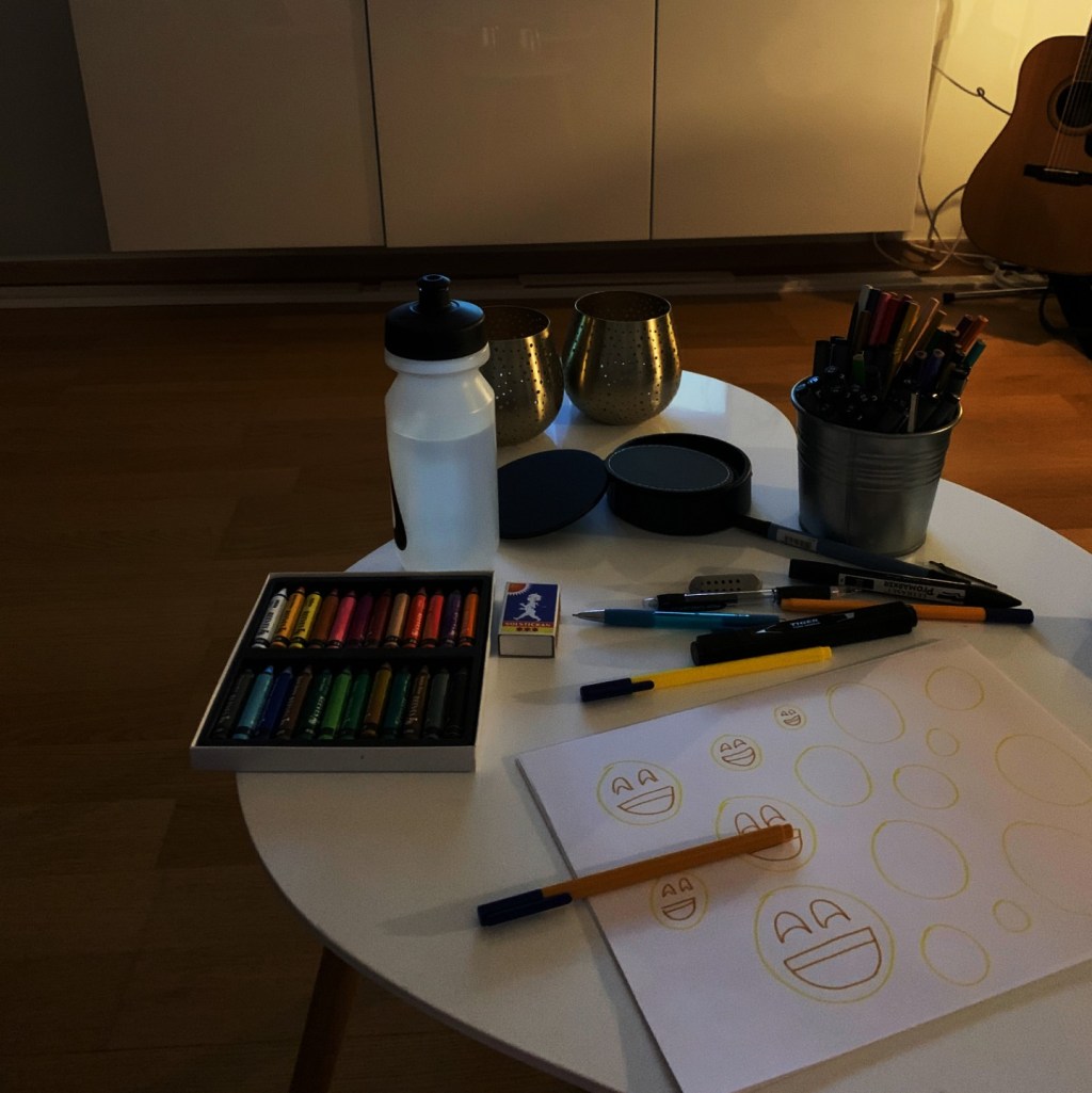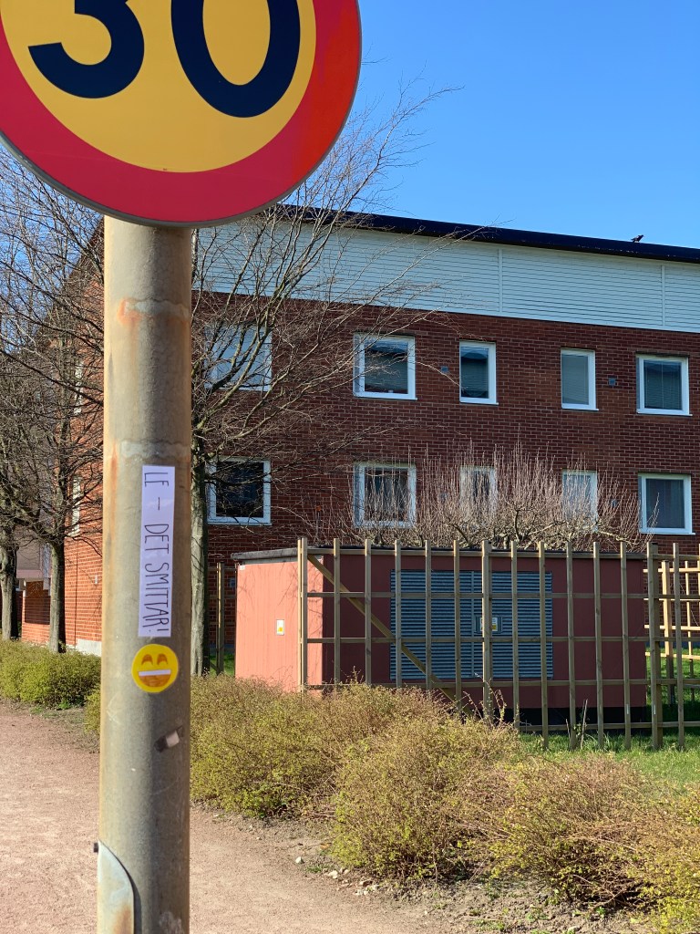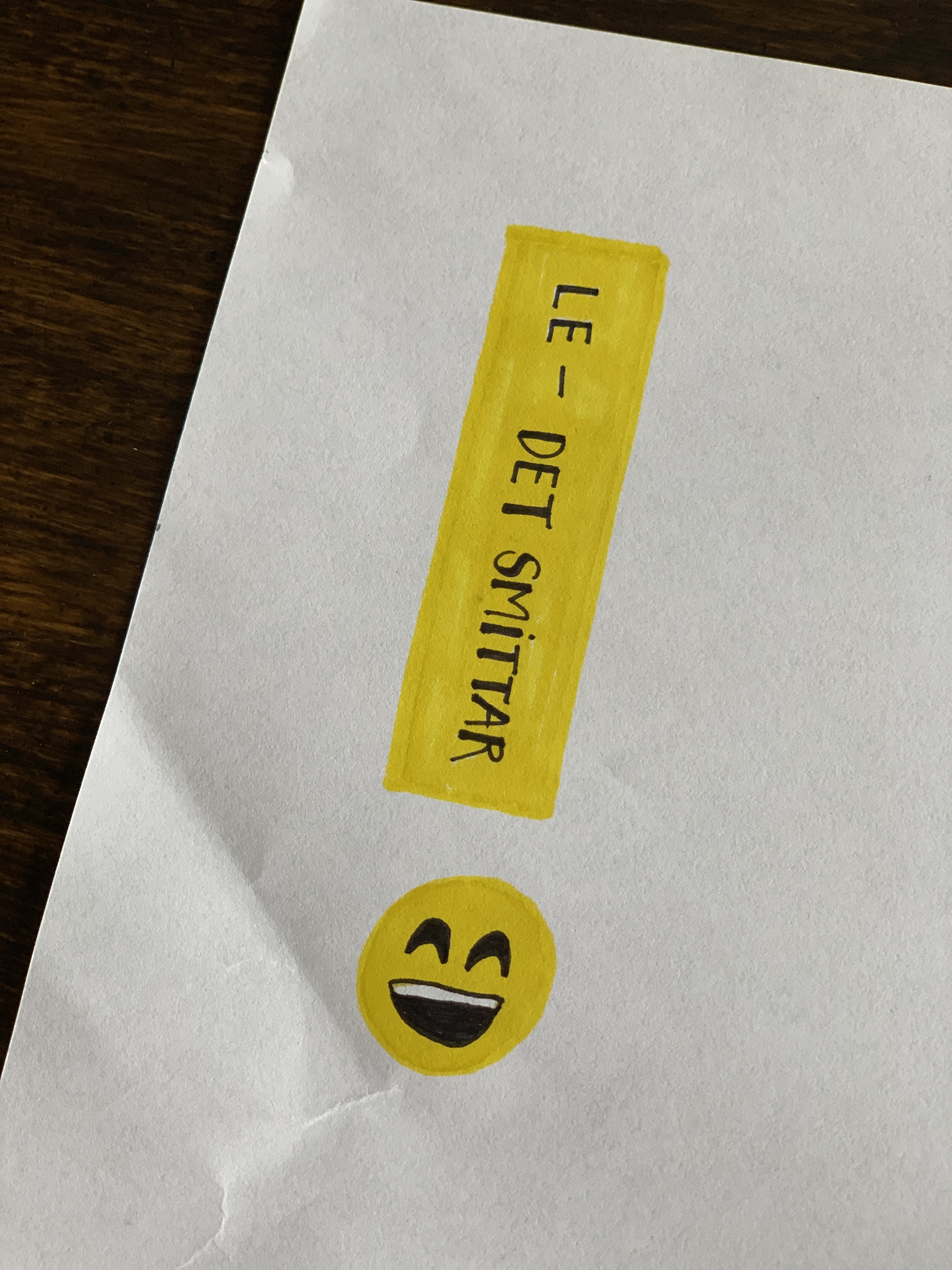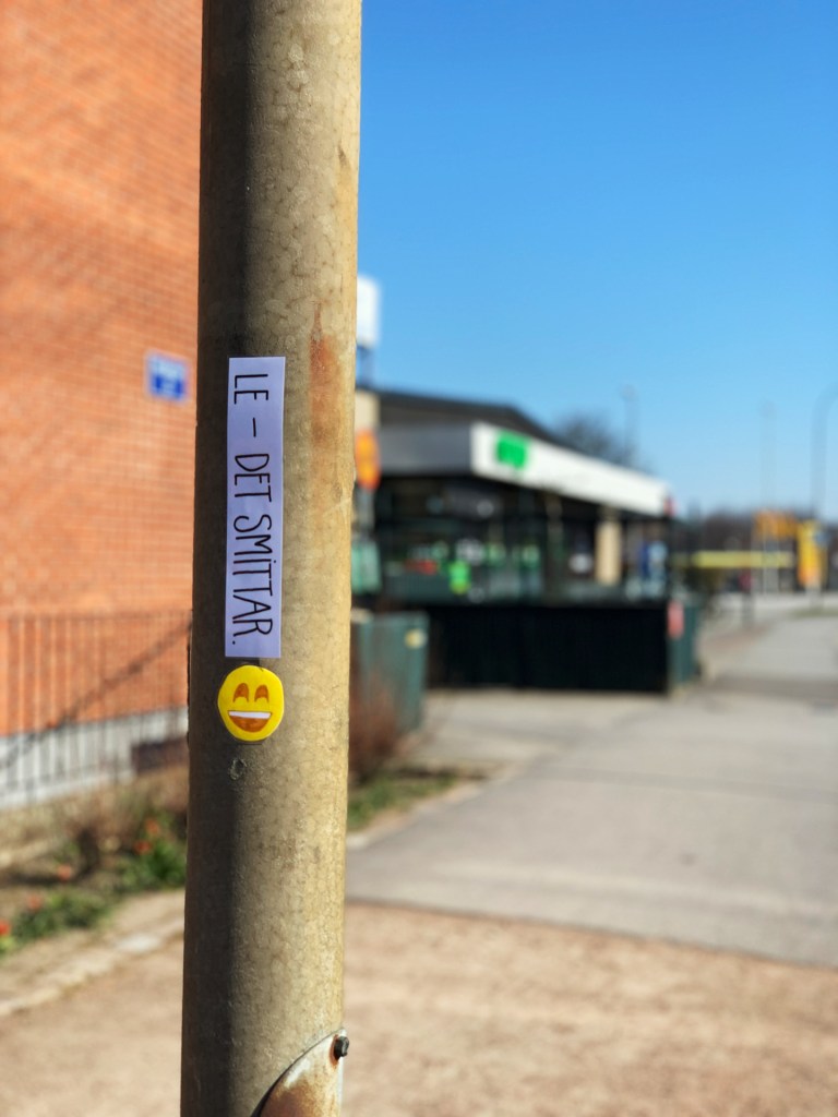 Jag skrev texterna för hand på papper följt av att illustrera glada ”emojis”. Användandet av en emoji skulle göra att fler skulle känna igen den. Det jag sedan gjorde var att laminera allting för att slutligen fästa allting på lyktstolparna.