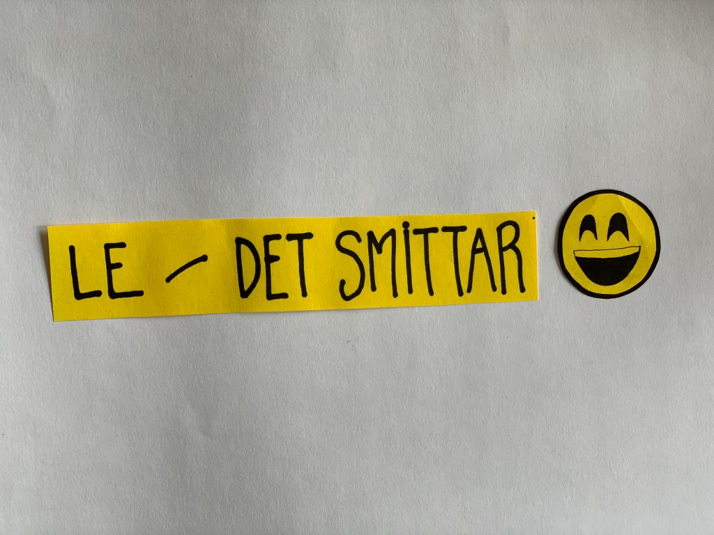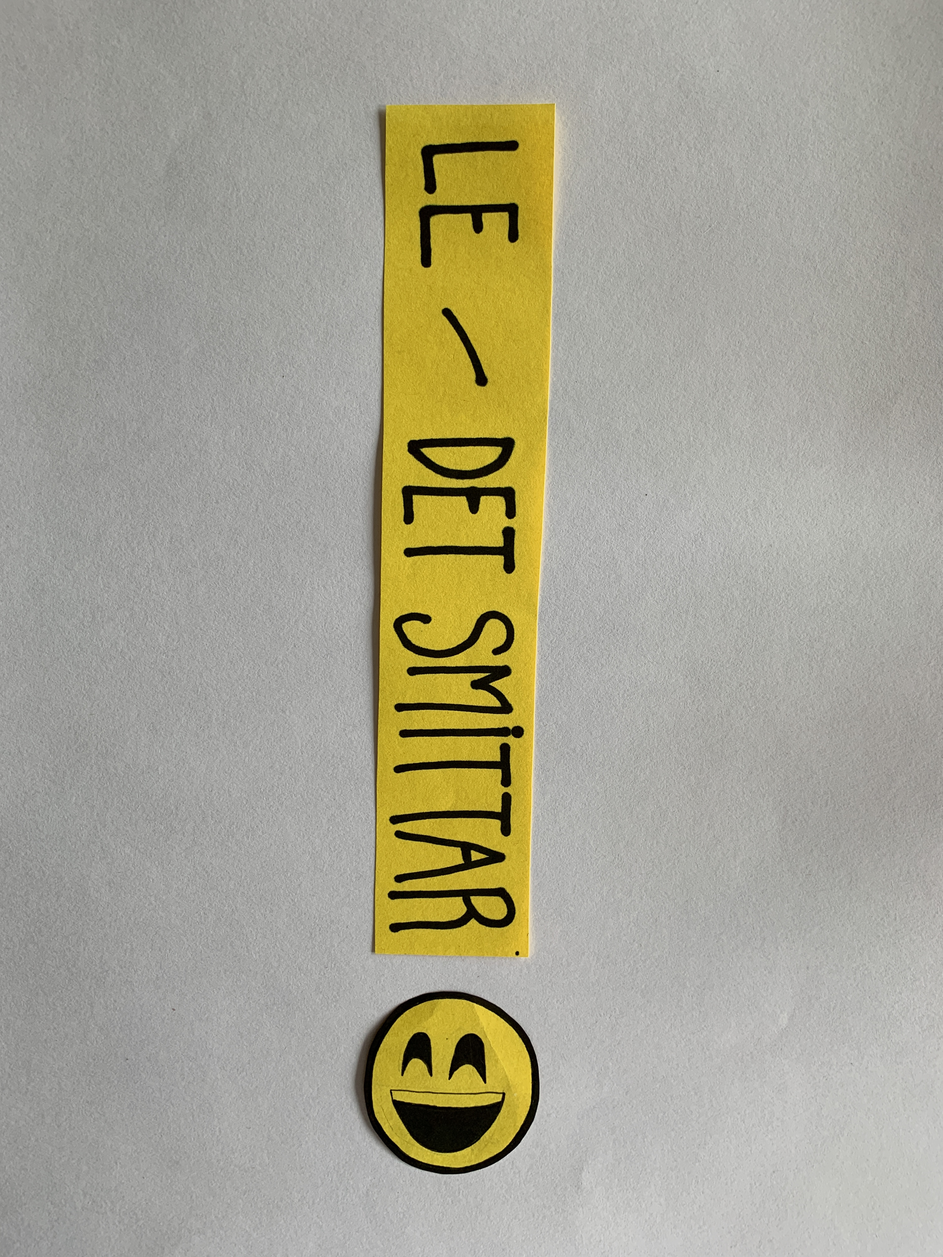 Min idé gällande layout var att text och bild tillsammans skulle forma ett utropstecken. Ett tecken för att markera och understryka budskapet, om än något subtilt. Jag formulerade olika ”punchlines” som alla skulle innehålla ordet smitta. Jag ville betona att i dessa svåra tider kan något som ett litet leende få smitta och spridas över vårt land.