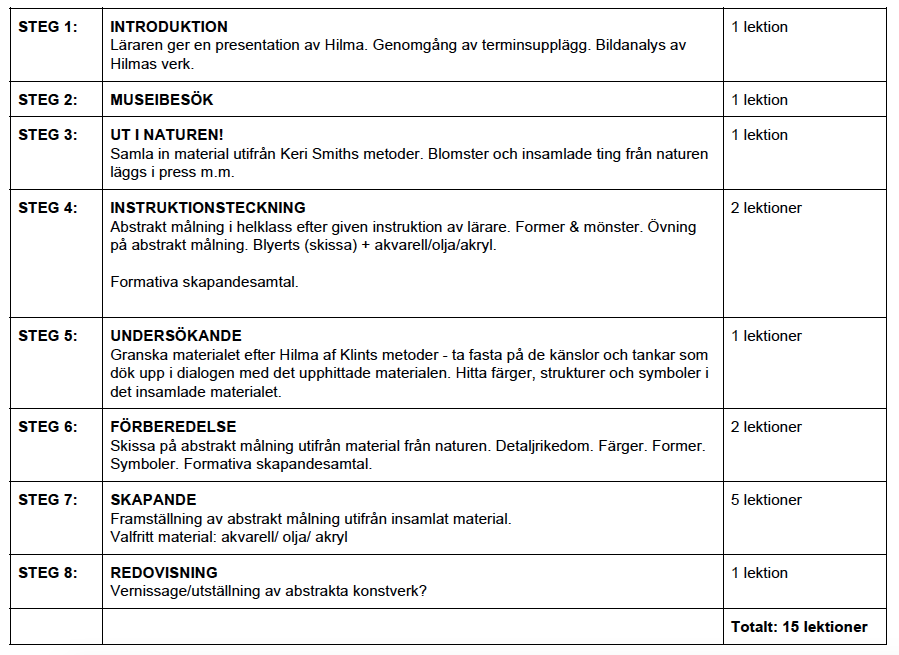 Terminens inledande museibesök ska syfta till att ge eleverna en inspirerande och motiverande introduktion för det kommande arbetet under terminen. Botaniken och växtligheten i Hilmas skapandeprocesser kommer ligga till grund och vara vår inspiration under detta projekt. Om en elev är sjuk får ges möjlighet att ta sig till museet själv för att ta del av konsten samt en kompletterande inspelad föreläsning av läraren. Detta för att spara tid.