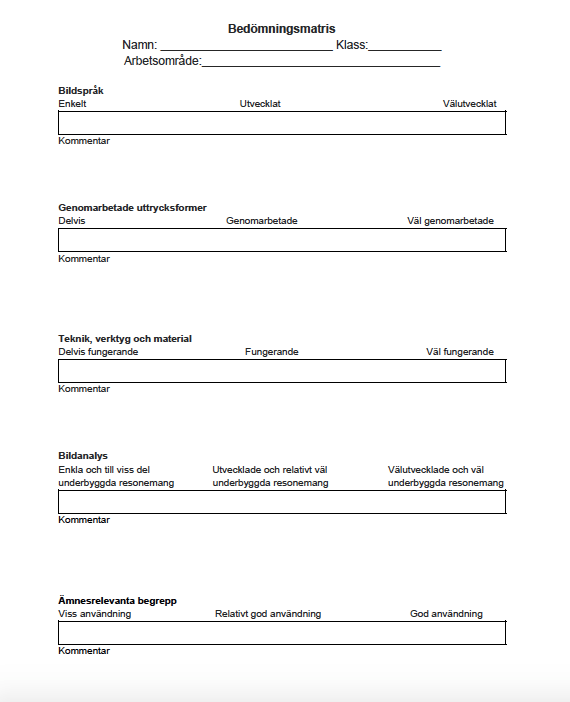 Kunskapskraven för uppgiften tydliggörs i matriser, dessa används som bedömningsunderlag. Genom kamratrespons och formativa skapandesamtal med läraren, kommer eleverna under hela processen att arbeta nära kunskapskraven.